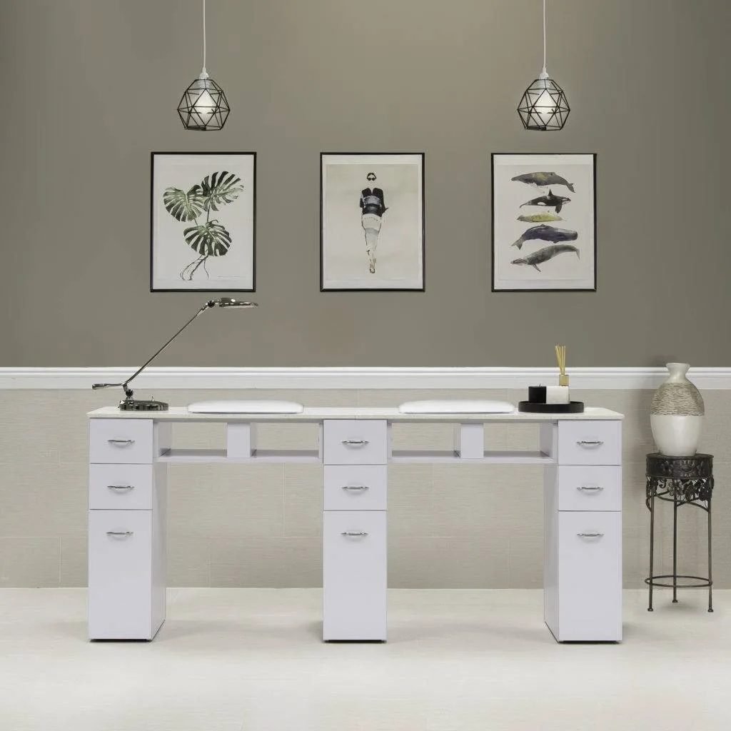 A double nail table that’s as comfortable as it is functional, with a white finish that makes it a stylish addition to your salon. Perfectly sized to accommodate two nail technicians, the compact design means you can fit it in anywhere and the white granite top makes it quick and easy to clean.