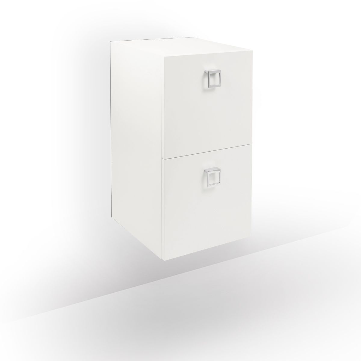 Wall hanging storage cabinet with 1, upper, drawer and 1, lower, hinged door compartment. Available in 3 different finishes, see Materials below, supplied with chrome handles.